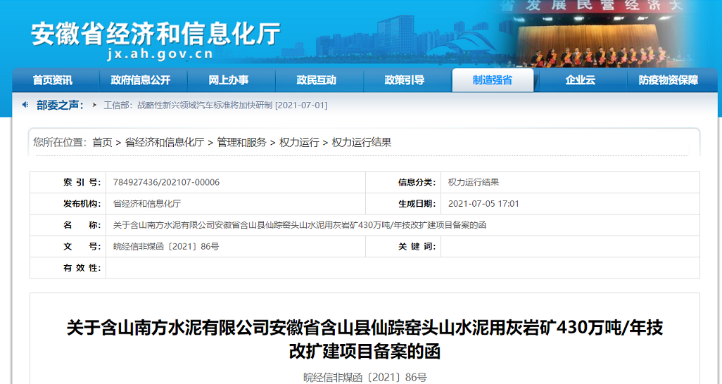 馬鞍山市經濟和信息化局《關于對含山南方水泥有限公司安徽省含山縣仙蹤窯頭山水泥用灰巖礦430萬噸/年技改擴建項目可行性研究報告(送審稿)申請核查的請示》(馬經信〔2021〕55號)及有關材料悉。