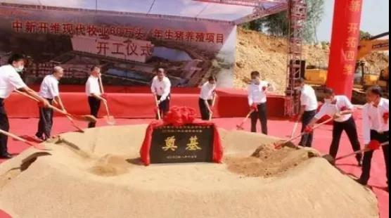 2020年8月17日上午,湖北中新開維現代牧業有限公司年產60萬頭生豬養殖項目開工典禮在湖北世紀新峰雷山水泥廠區內隆重舉行。項目計劃投資20億元,建設單體26層高的生產大樓及附屬建筑,總建筑面積45萬平方米,建成后年出欄生豬量可達60萬頭。