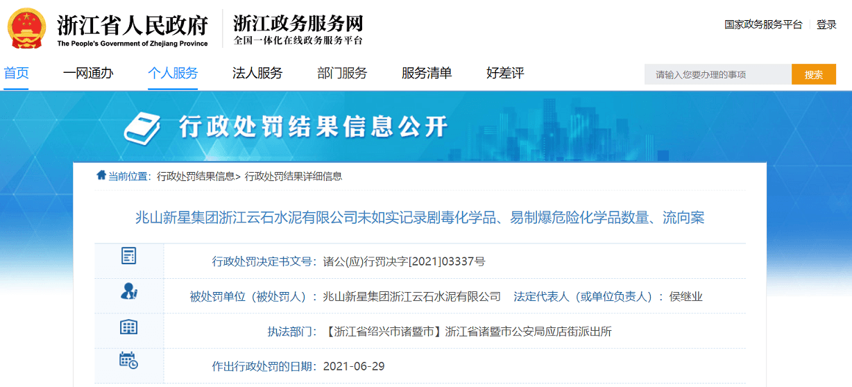 日前,浙江省人民政府政務服務網,通報了兆山新星集團浙江云石水泥有限公司未如實記錄劇毒化學品、易制爆危險化學品數量、流向案。