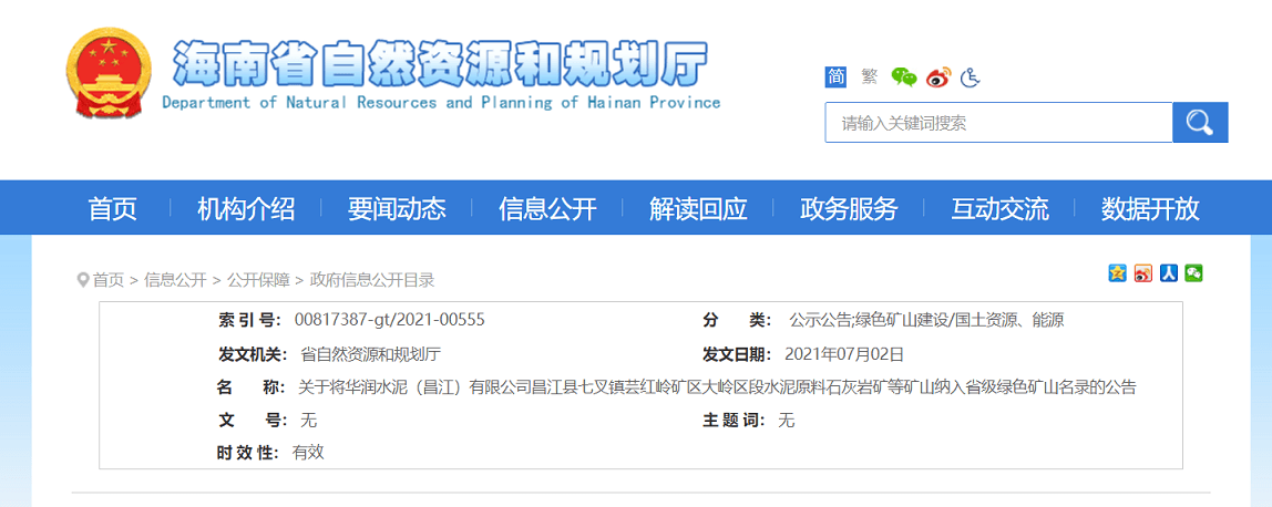 根據《海南省自然資源和規劃廳關于做好2021年度省級綠色礦山建設工作的通知》(瓊自然資函〔2021〕618號)要求,在企業自評、第三方評估基礎上,經組織實地核查、專題會審議、社會公示,2021年上半年共有華潤水泥(昌江)有限公司昌江縣七叉鎮蕓紅嶺礦區大嶺區段水泥原料石灰巖礦、保亭七仙嶺怡森飲料有限公司海南省保亭縣保城鎮新村ZK15井飲用天然礦泉水共2家礦山通過遴選,現納入省級綠色礦山名錄,接受社會監督。