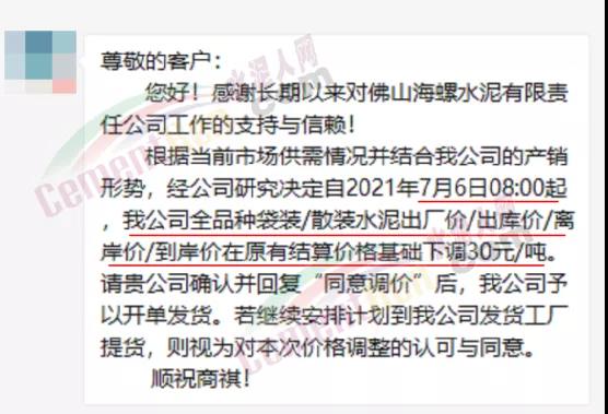 水泥人網信息中心消息,日前廣東省佛山海螺水泥通知:自2021年7月6日8時起,全品種袋裝/散裝水泥出廠價/出庫價/離岸價/到岸價在原有結算價格基礎下調30元/噸。