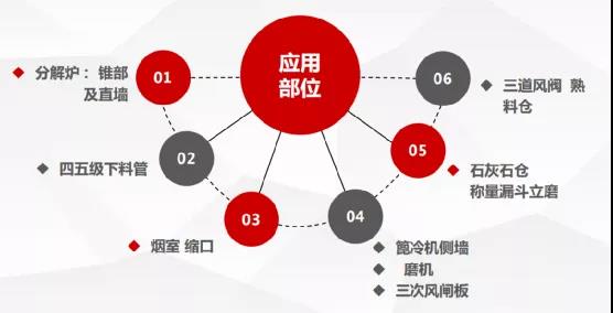 為解決水泥行業長期以來的困擾,水泥人網經過長期的市場調研,發現微晶產品的應用在緩解水泥預分解系統結皮的問題上作用明顯。山東淄博乾沃工貿有限公司(以下簡稱“乾沃工貿”)是一家國內最早研制微晶耐磨防結皮材料的企業,專注于微晶新材研發多年,其生產的水泥窯專用微晶耐磨防結皮新材可應用于水泥行業的煙室、篦冷機、預熱器、下料管、磨機內襯、脫硝器內襯、筒倉內襯等多個部位。具體如圖1