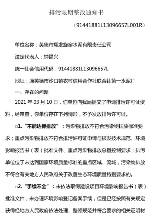 其中,今年3月30日下達(dá)限期整改的廣東清遠(yuǎn)英德市翔發(fā)旋窯水泥有限責(zé)任公司整改問題為“未按規(guī)定對廢氣進(jìn)行收集處理、未進(jìn)行無組織排放控制要求、其他-未按規(guī)定設(shè)置污染物排放口、未完成自主驗收手續(xù)”等。企業(yè)整改措施、整改計劃如下: