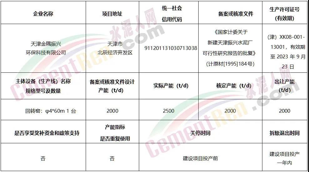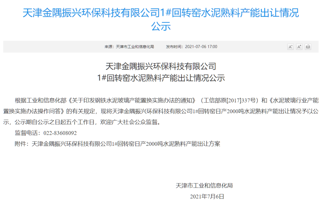 日前,天津市工業和信息化局發布《天津金隅振興環保科技有限公司1#回轉窯水泥熟料產能出讓情況公示》,將天津金隅振興環保科技有限公司2000t/d水泥熟料產能將出讓至華潤水泥(封開)有限公司。