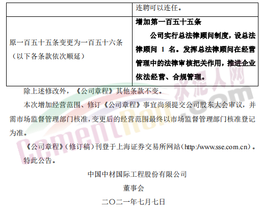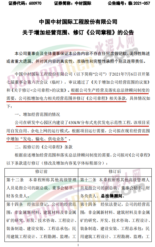 7月6日,中國中材國際工程股份有限公司發布《關于增加經營范圍、修訂公司<章程>的公告》稱,公司擬增加電力相關經營范圍并修訂《公司章程》相關條款。具體情況為: