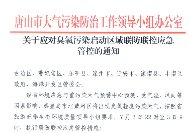 7月7日唐山市大氣污染防治工作領導小組辦公室發布《關于應對臭氧污染啟動區域聯防聯控的通知》稱,根據省生態環境預警中心預測,7月8日至11日唐山市將出現臭氧污染天氣過程,達到中度污染程度,按照《2021年旅游旺季北戴河及周邊區域環境質量保障總體工作方案》和《唐山市重污染天氣應急預案》要求,在確保安全的前提下,7月8日0時至12日10時執行減排措施.