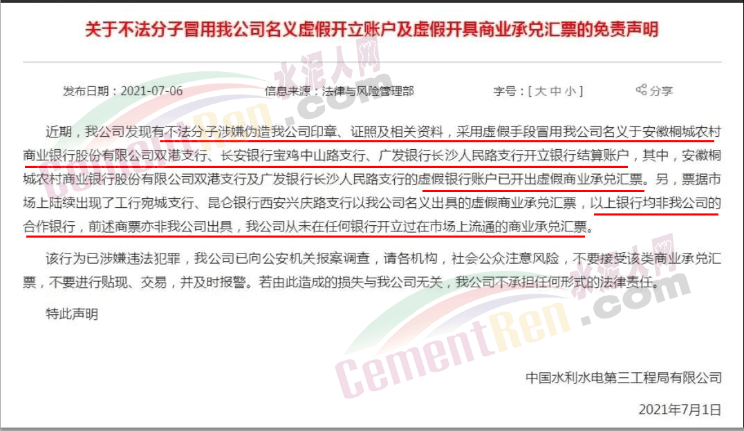 日前,中國水利水電第三工程局有限公司發(fā)布《關于不法分子冒用我公司名義虛假開立賬戶及虛假開具商業(yè)承兌匯票的免責聲明》稱,近期公司發(fā)現(xiàn)有不法分子涉嫌偽造中國水利水電第三工程局有限公司印章、證照及相關資料,采用虛假手段冒用中國水利水電第三工程局有限公司名義于開立銀行結算賬戶。并有部分虛假銀行賬戶已開出虛假商業(yè)承兌匯票。且公司從未在任何銀行開立過在市場上流通的商業(yè)承兌匯票。