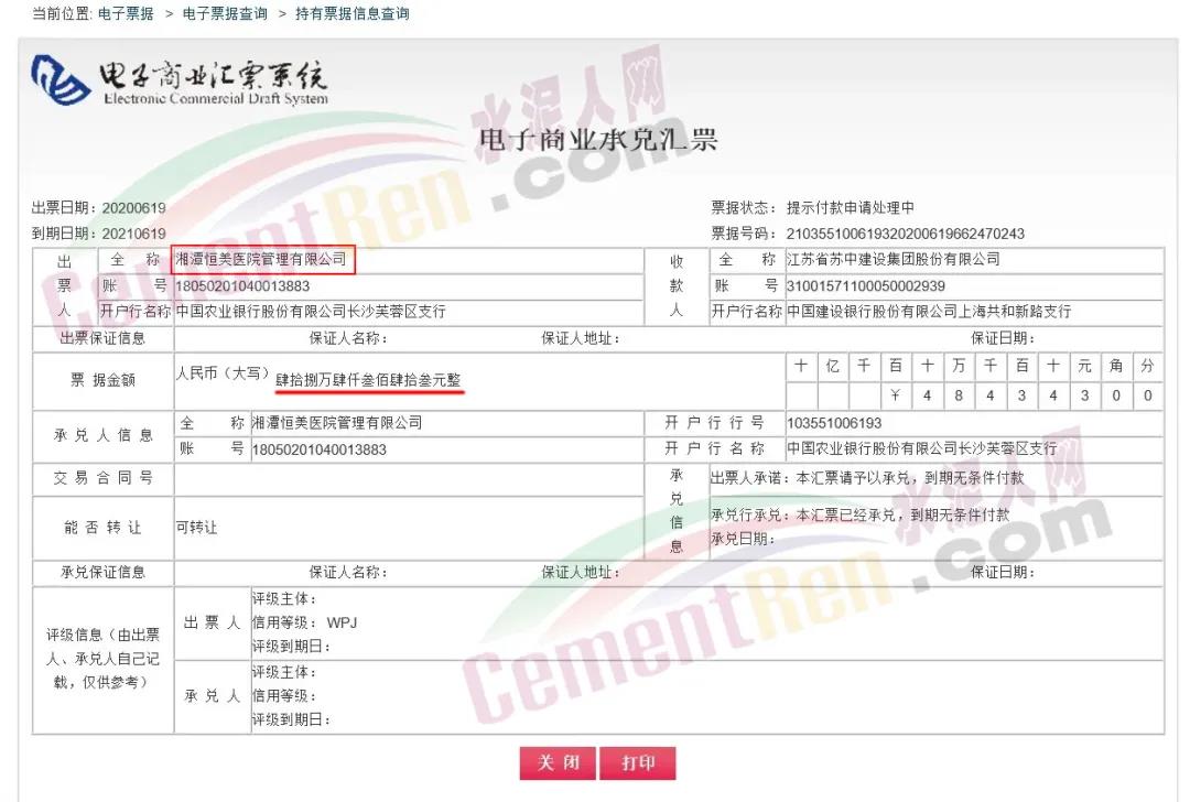 2021年6月19日,湘潭恒美醫(yī)院管理有限公司向江蘇省蘇中建設集團股份有限公司開出的一張一年期48.4萬元商業(yè)承兌匯票到期,債務人仍未付款,票據(jù)被申請付款處理中。