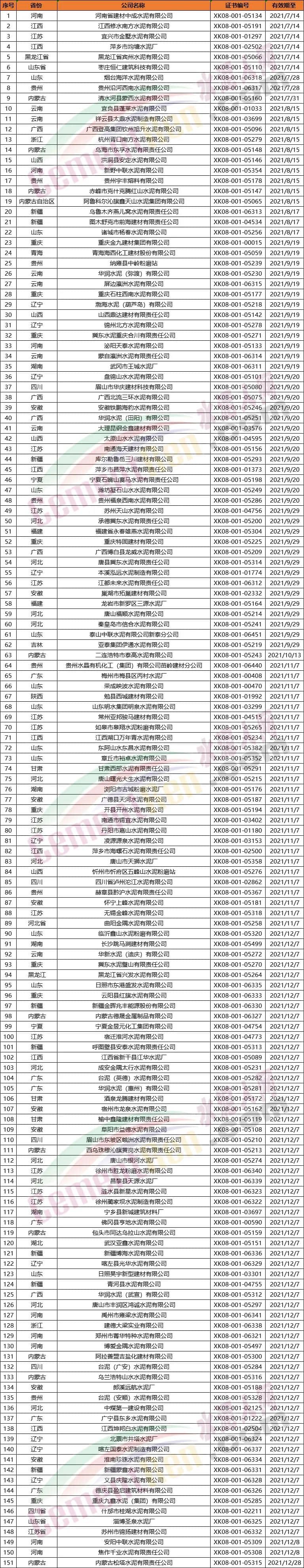 151家生產(chǎn)許可證將到期水泥企業(yè)名單