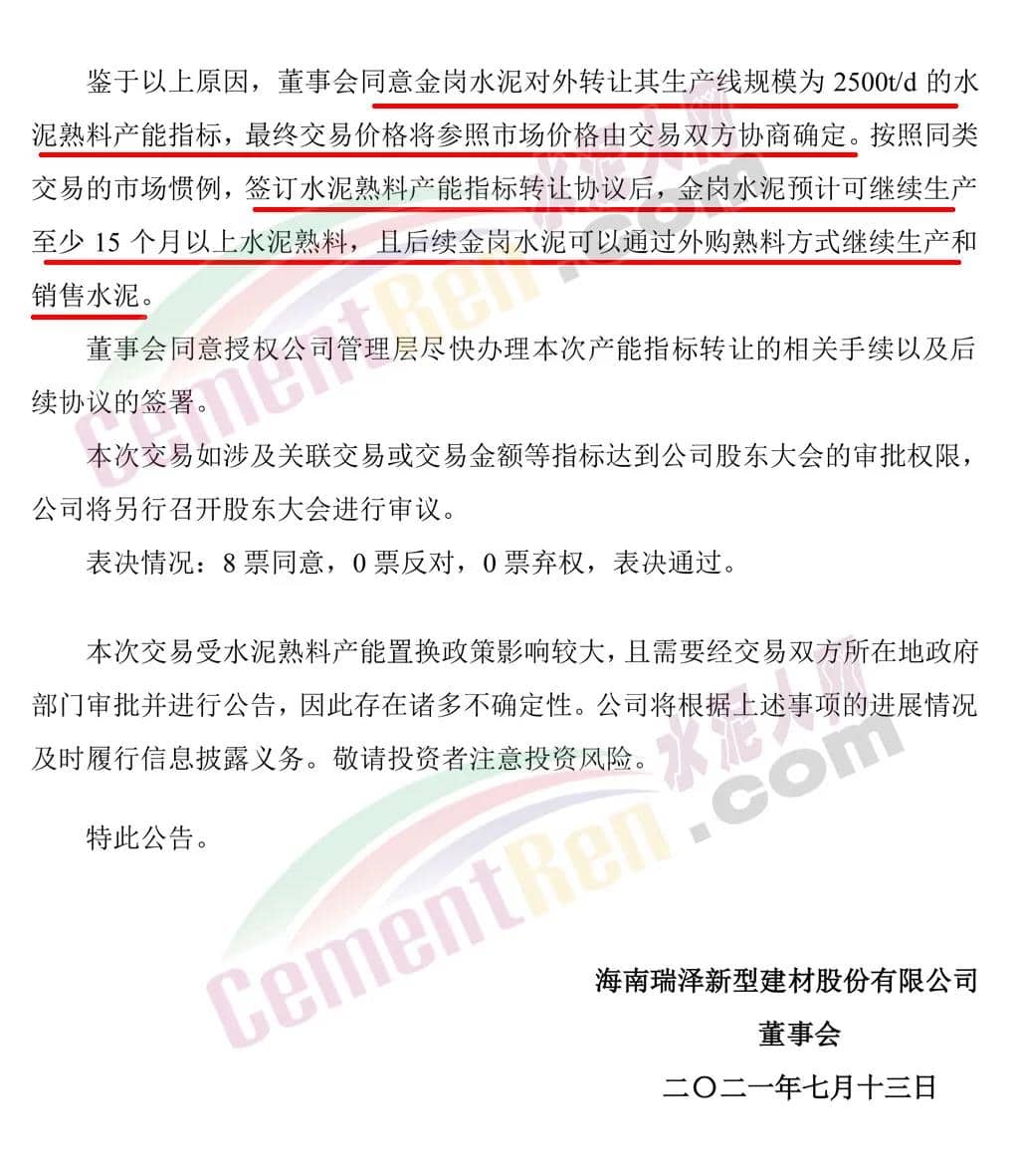 鑒于以上原因,董事會同意金崗水泥對外轉讓其生產線規模為2500t/d的水泥熟料產能指標,最終交易價格將參照市場價格由交易雙方協商確定。按照同類交易的市場慣例,簽訂水泥熟料產能指標轉讓協議后,金崗水泥預計可繼續生產至少15個月以上水泥熟料,且后續金崗水泥可以通過外購熟料方式繼續生產和銷售水泥。