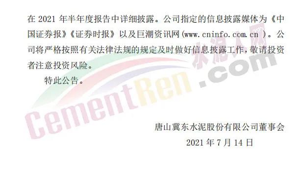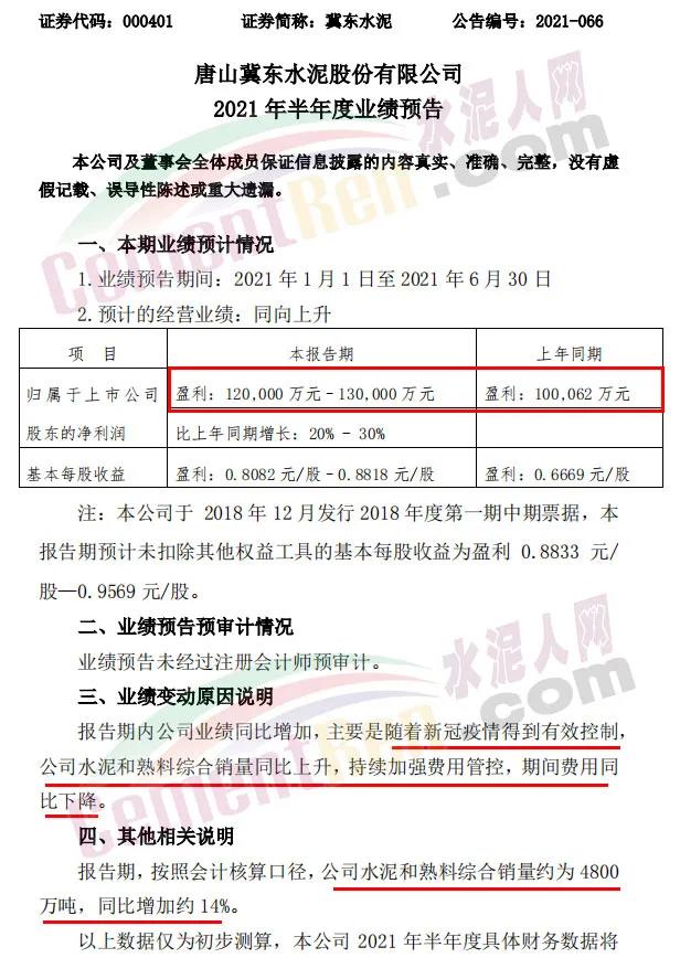 冀東水泥(000401.SZ)13日晚披露的2021年半年度業績預告顯示,公司預計上半年歸屬于上市公司股東的凈利潤為12億元~13億元,比上年同期增長20%-30%。去年上半年,冀東水泥歸屬于上市公司股東的凈利潤為10.01億元。