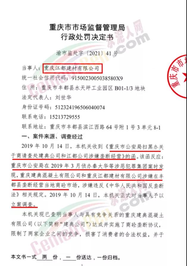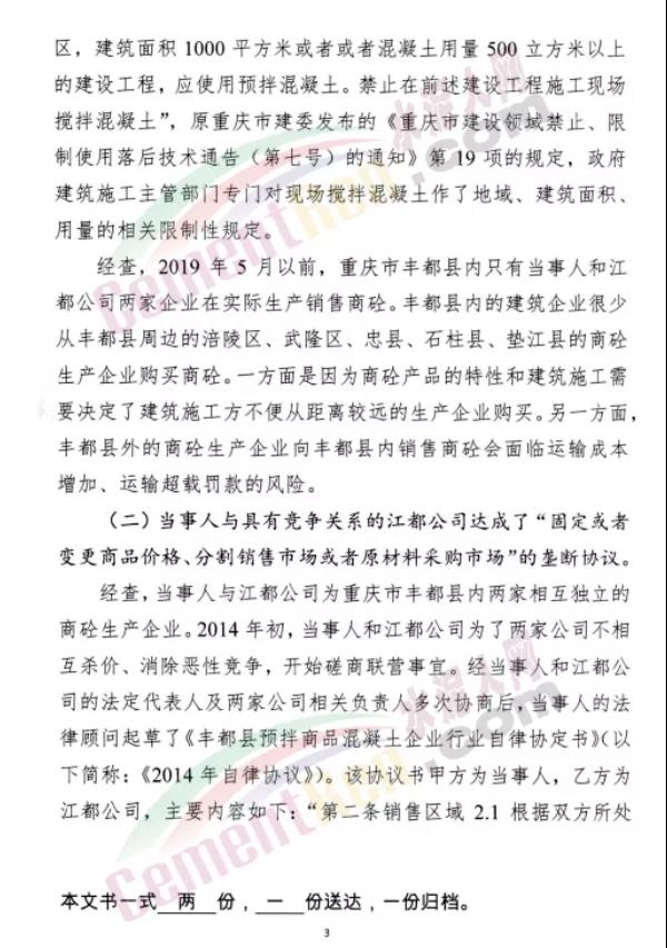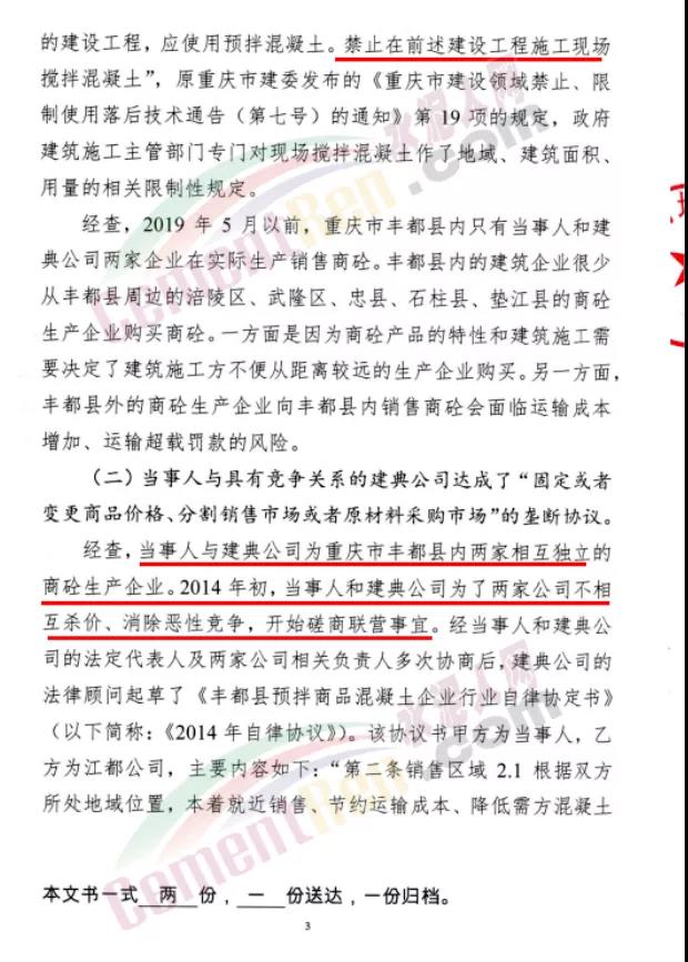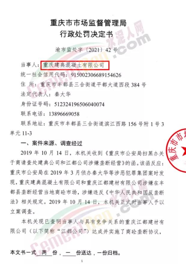 7月15日市場(chǎng)監(jiān)管總局發(fā)布重慶市豐都縣2家商砼生產(chǎn)企業(yè)壟斷協(xié)議案的處罰決定稱,重慶市市場(chǎng)監(jiān)督管理局于2019年10月對(duì)重慶江都建材有限公司、重慶建典混凝土有限公司涉嫌壟斷協(xié)議行為立案調(diào)查。經(jīng)調(diào)查,2021年6月15日重慶市市場(chǎng)監(jiān)督管理局對(duì)2家涉案當(dāng)事人達(dá)成、實(shí)施壟斷協(xié)議行為作出行政處罰決定,合計(jì)實(shí)施處罰2312.882萬(wàn)元。