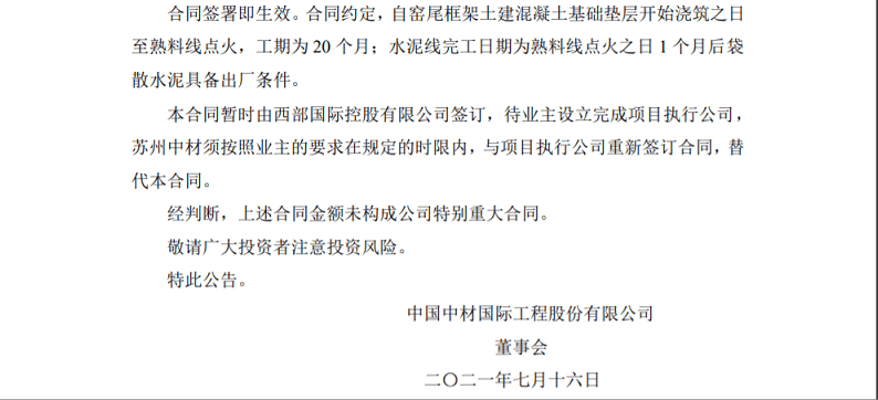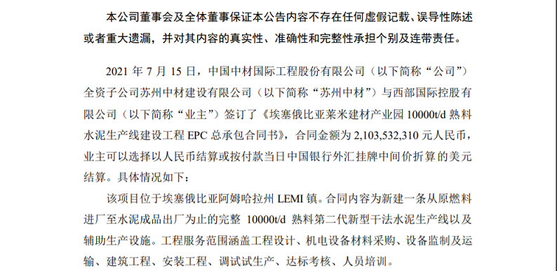 7月15日,中材國(guó)際(600970)發(fā)公告稱,中國(guó)中材國(guó)際工程股份有限公司全資子公司蘇州中材建設(shè)有限公司(以下簡(jiǎn)稱“蘇州中材”)與西部國(guó)際控股有限公司(以下簡(jiǎn)稱“業(yè)主”)簽訂了《埃塞俄比亞萊米建材產(chǎn)業(yè)園10000t/d熟料水泥生產(chǎn)線建設(shè)工程EPC總承包合同書(shū)》,合同金額為2,103,532,310元人民幣,業(yè)主可以選擇以人民幣結(jié)算或按付款當(dāng)日中國(guó)銀行外匯掛牌中間價(jià)折算的美元結(jié)算。具體情況如下:
