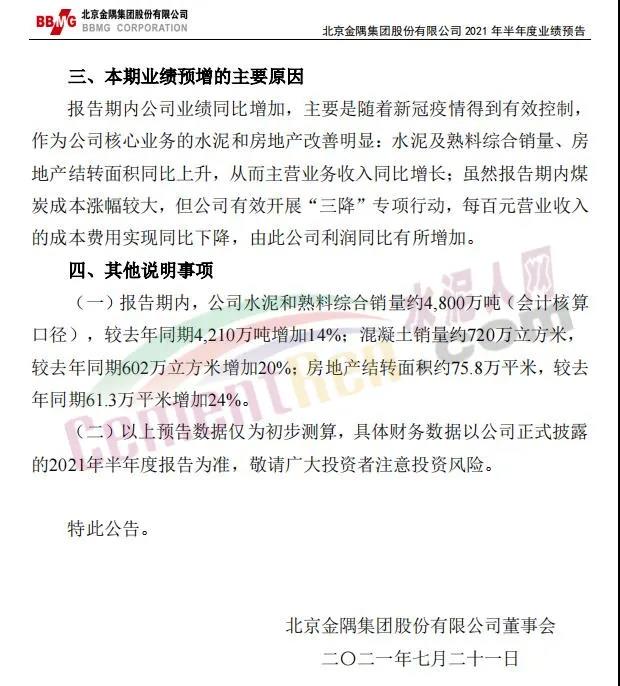 對于上述業績預增的原因,金隅集團表示,主要原因是隨著新冠疫情得到有效控制,公司核心業務水泥和房地產改善明顯;水泥及熟料綜合銷量、房地產結轉面積同比上升,從而主營業務收入同比增長;雖然報告期內煤炭成本漲幅較大,但公司有效開展“三降”專項行動,每百元營業收入的成本費用實現同比下降,由此公司利潤同比有所增加。