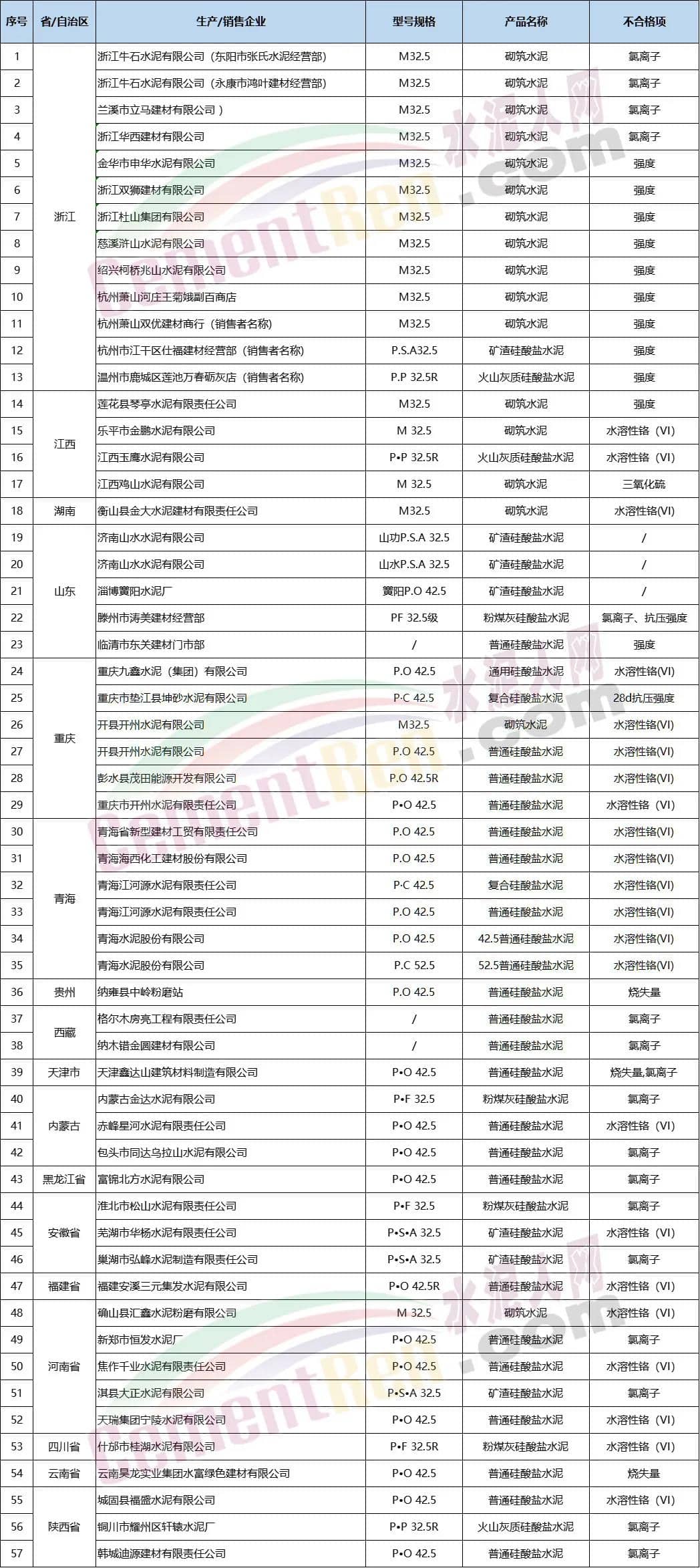 從多個省市自治區通報的不合格水泥名單可見,質量不合格水泥分布在浙江、江西、湖南、山東、重慶、青海、貴州、西藏、天津、內蒙古、黑龍江、安徽、福建、河南、四川、云南、陜西等十多個省市自治區,涉及的不合格項目也多是“普遍問題”。