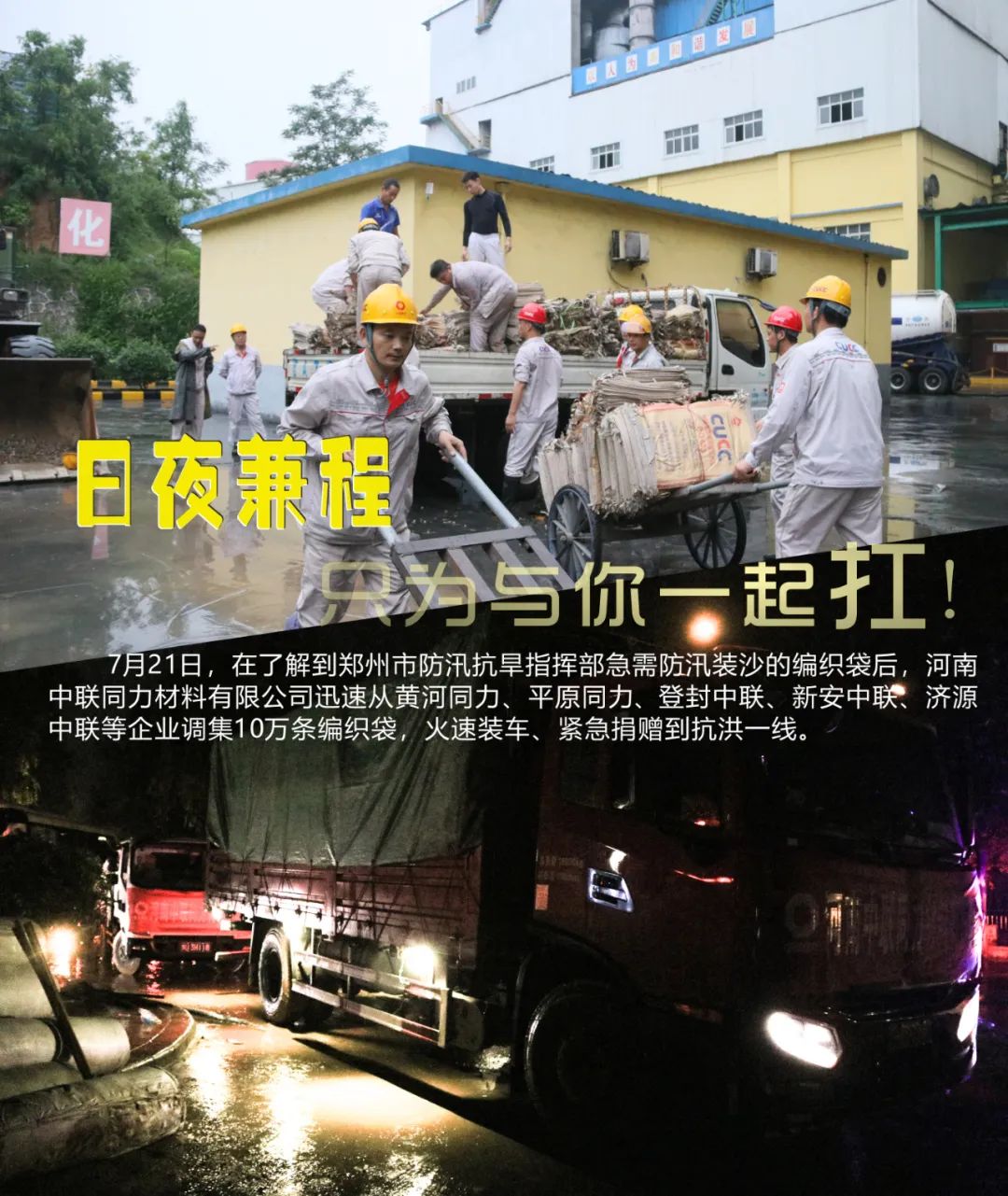 7月21日,得知鄭州市防汛抗旱指揮部,急需防汛裝沙編織袋的信息。根據中國聯合水泥防汛工作安排部署,河南中聯同力材料有限公司緊急組織登封中聯、新安中聯、濟源中聯、黃河同力、平原同力等企業,第一時間籌集抗洪物資