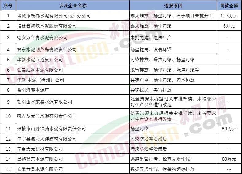 各省市地區生態環境部門通報冀東水泥、盤景水泥、福建水泥等水泥企業弄虛作假,污染超標、未批先建、整治進度滯后等問題