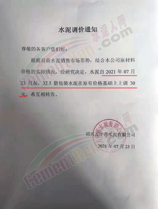 日前,浙江紹興區(qū)域多家水泥企業(yè)通知自23日起上調水泥價格30元/噸。其中,紹興萬年青水泥有限公司通知,根據(jù)目前水泥銷售市場形勢,結合公司原材料價格的實際情況,經研究決定,自7月23日起32.5散、包水泥在原有價格基礎上上調30元/噸。