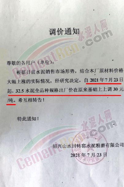 紹興山水回轉窯水泥粉磨有限公司通知,自7月23日起32.5水泥全品種規(guī)格出廠價在原基礎上上調30元/噸。