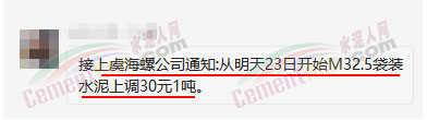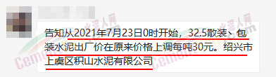 同期上虞區(qū)積山水泥、海螺水泥等通知從23日起上調32.5水泥價格30元/噸。