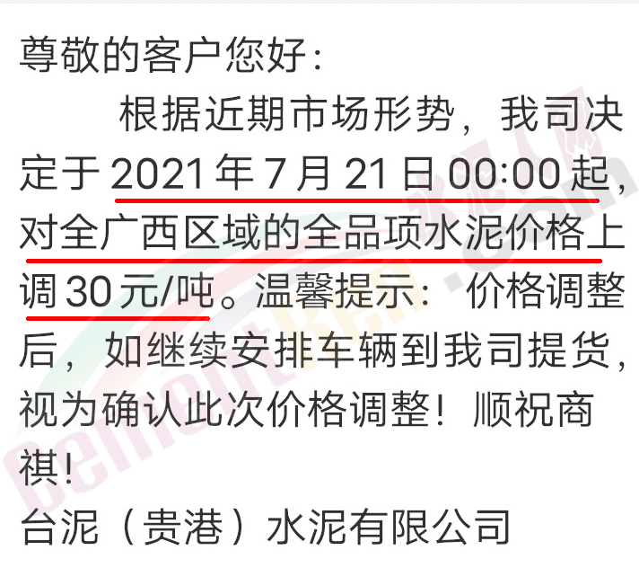 臺泥(貴港)水泥有限公司通知2021年7月21日0時起,對全廣西區(qū)域的全品項水泥價格上調30元/噸。