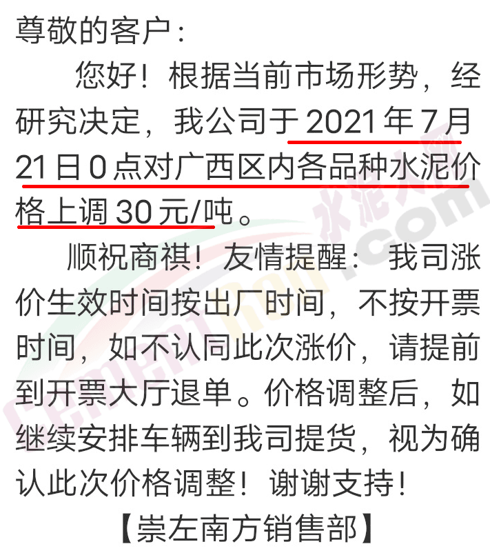 崇左南方銷售部通知于2021年7月21日0點對廣西區(qū)內各品種水泥價格上調30元/噸。如不認同此次漲價,請?zhí)崆暗介_票大廳退單。價格調整后,如繼續(xù)安排車輛提貨,視為確認此次價格調整。