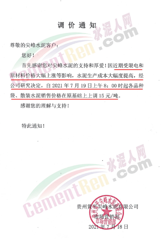 19日前后,貴州區(qū)域個別企業(yè)通知上調水泥價格15-20元/噸。其中貴州黃平尖峰水泥發(fā)調價通知稱,因近期受限電和原材料價格大幅上漲等影響,水泥生產成本大幅度提高,經公司研究決定上調各品牌袋、散裝水泥價格15元/噸。