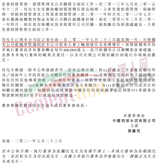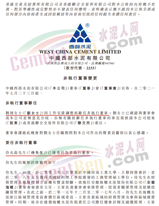 7月23日,西部水泥(02233)發布《非執行董事變更公告》,《公告》稱,自2021年7月23日起:劉剡因工作安排調整而辭任非執行董事。侍光磊已獲委任為非執行董事。具體公告如下: