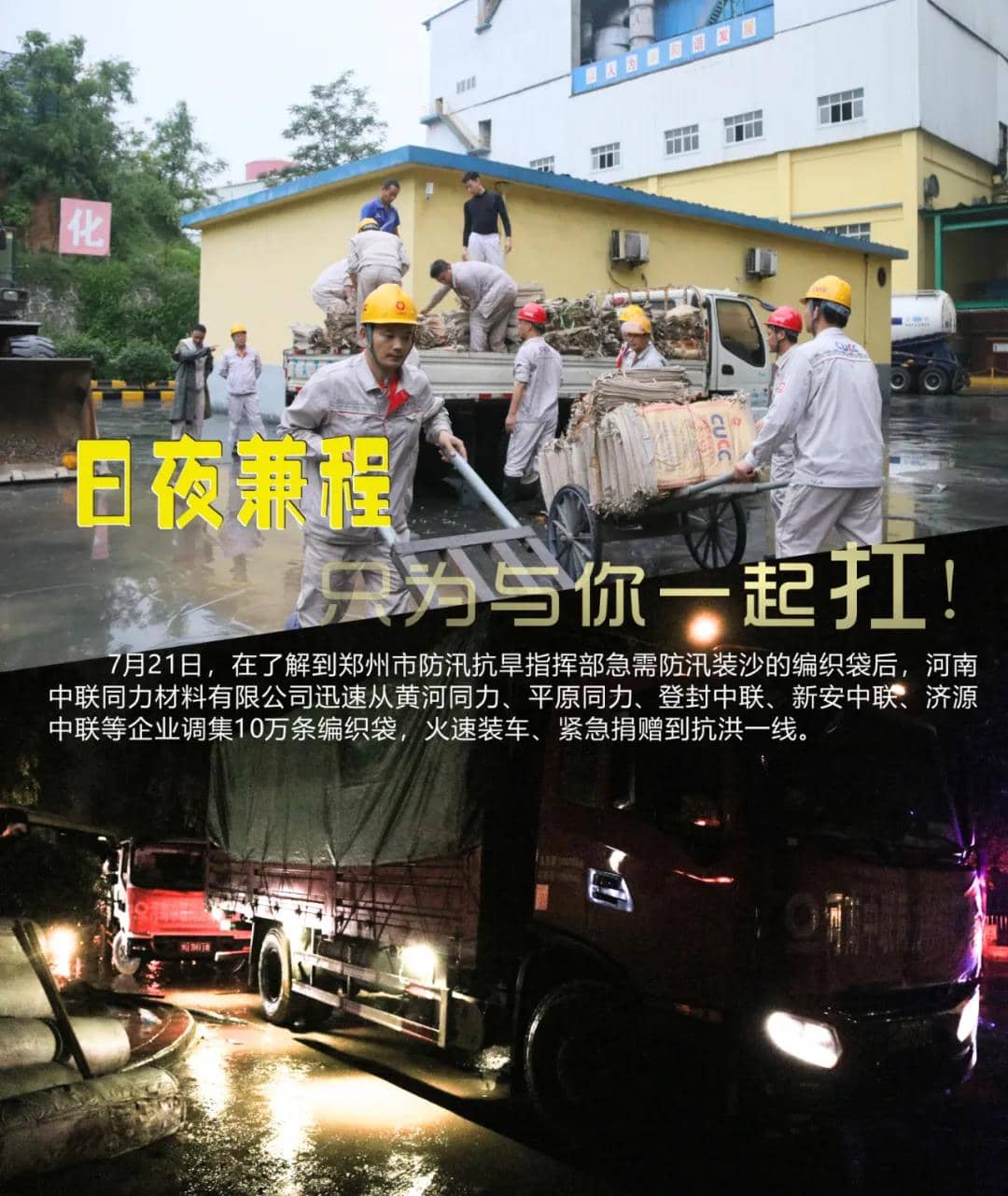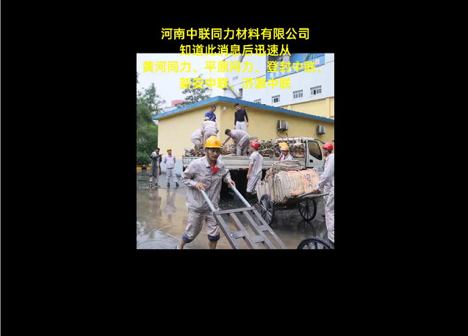 7月21日,得知鄭州市防汛抗旱指揮部,急需防汛裝沙編織袋的信息。根據(jù)中國聯(lián)合水泥防汛工作安排部署,河南中聯(lián)同力材料有限公司緊急組織登封中聯(lián)、新安中聯(lián)、濟(jì)源中聯(lián)、黃河同力、平原同力等企業(yè),第一時(shí)間籌集抗洪物資