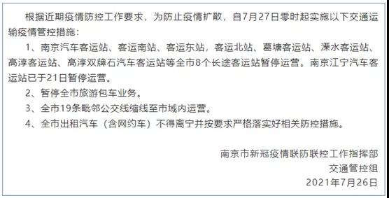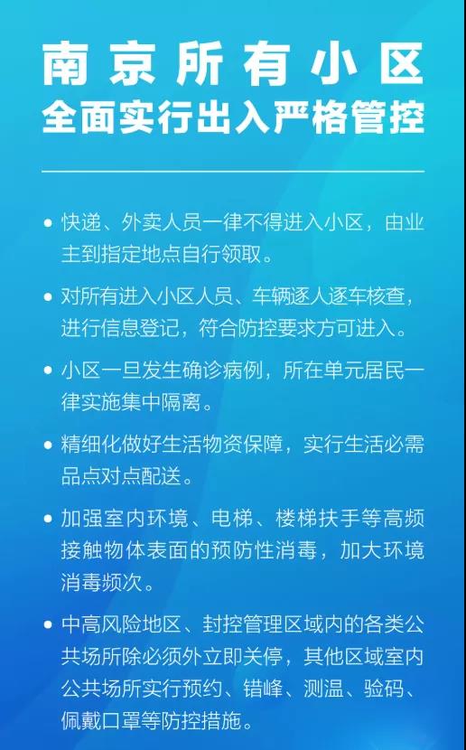 26日晚,江蘇省南京市新冠肺炎疫情聯防聯控指揮部社會和社區防控組發布通告:即日起,南京所有小區全面實行出入嚴格管控,快遞、外賣人員一律不得進入小區,由業主到指定地點自行領取。27日零時起,南京暫停運營全市8個長途客運站,暫停全市旅游包車業務,全市19條毗鄰公交線縮線至市域內運營,全市出租汽車(含網約車)不得離寧并按要求嚴格落實好相關防控措施。