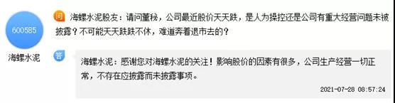 面對連續(xù)下跌的股價,有投資者對海螺水泥提出質(zhì)疑稱:公司股價最近天天跌,是人為操控還是公司有重大經(jīng)營問題未披露?不可能天天跌跌不休,難道奔著退市去的?