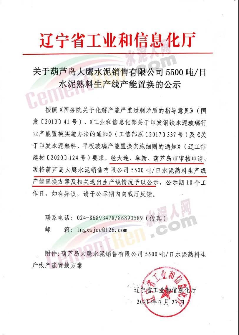 日前,遼寧省工信廳發(fā)布《關于葫蘆島大鷹水泥銷售有限公司5500t/d水泥熟料生產(chǎn)線產(chǎn)能置換的公示》稱,按照相關文件要求,經(jīng)大連、阜新、葫蘆島市審核申請,現(xiàn)將葫蘆島大鷹水泥銷售有限公司5500噸/日水泥熟料生產(chǎn)線產(chǎn)能置換方案及相關退出生產(chǎn)線情況予以公示,公示期10個工作日。