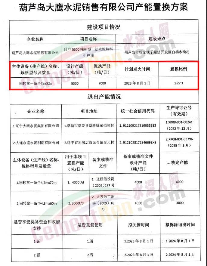 退出項目合計產(chǎn)能為7000t/d,置換比例為1.27:1。退出項目為,遼寧大鷹水泥集團有限公司、大連永盛制造有限公司Φ4.7m*70m和Φ4.3m*60m窯線各一條,核定產(chǎn)能分別為4000t/d和3000t/d,兩將窯線都將于2023年8月1日前關停,并于2024年8月1日前拆除退出。