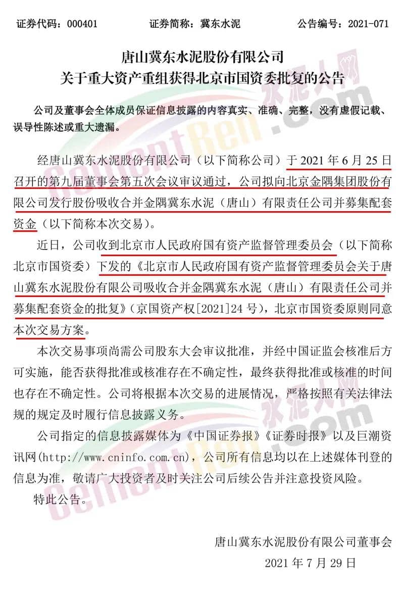 近日,公司收到北京市人民政府國有資產監督管理委員會下發的《北京市人民政府國有資產監督管理委員會關于唐山冀東水泥股份有限公司吸收合并金隅冀東水泥(唐山)有限責任公司并募集配套資金的批復》(京國資產權[2021]24號),北京市國資委原則同意本次交易方案。