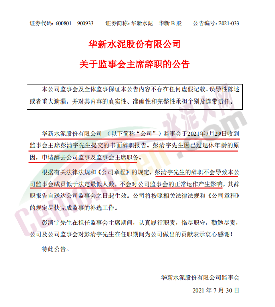 華新水泥7月29日晚間公告《關于監事會辭職的公告》稱,公司監事會于2021年7月29日收到監事會主席彭清宇先生提交的書面辭職報告。彭清宇先生因已過退休年齡的原因,申請辭去公司監事及監事會主席職務。
