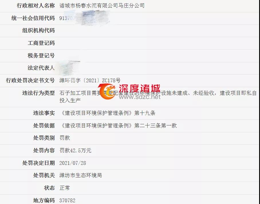 諸城市楊春水泥有限公司馬莊分公司被罰48.75萬元