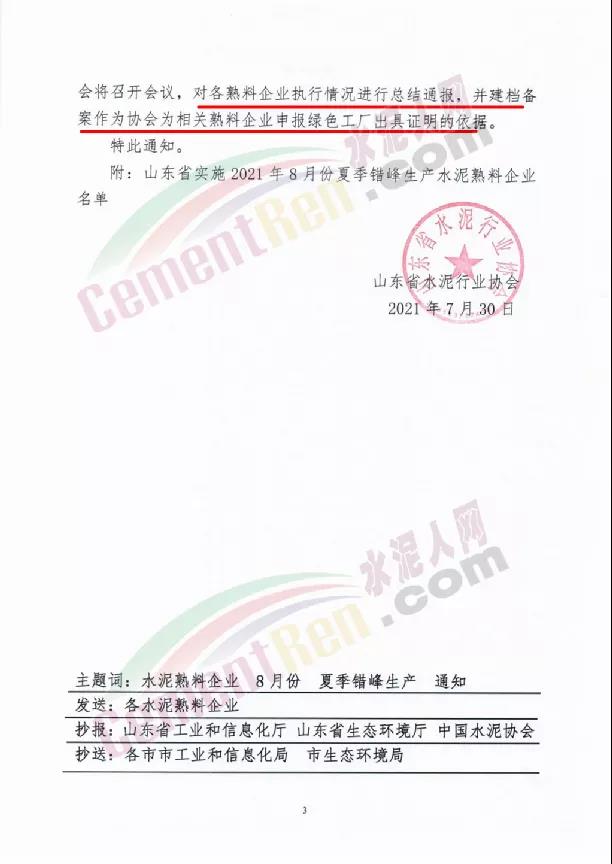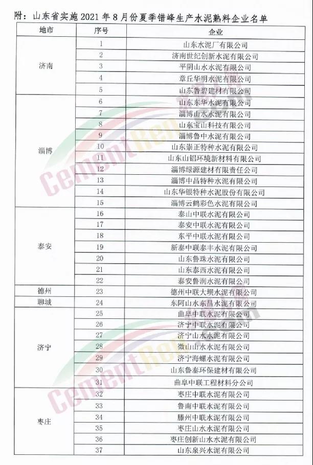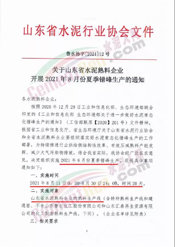 7月30日山東省水泥行業(yè)協(xié)會發(fā)布《關于山東省水泥熟料企業(yè)開展2021年8月份夏季錯峰生產(chǎn)的通知》稱按照相關文件要求將組織山東省水泥熟料企業(yè)的熟料生產(chǎn)線實施2021年8月份夏季錯峰生產(chǎn)。