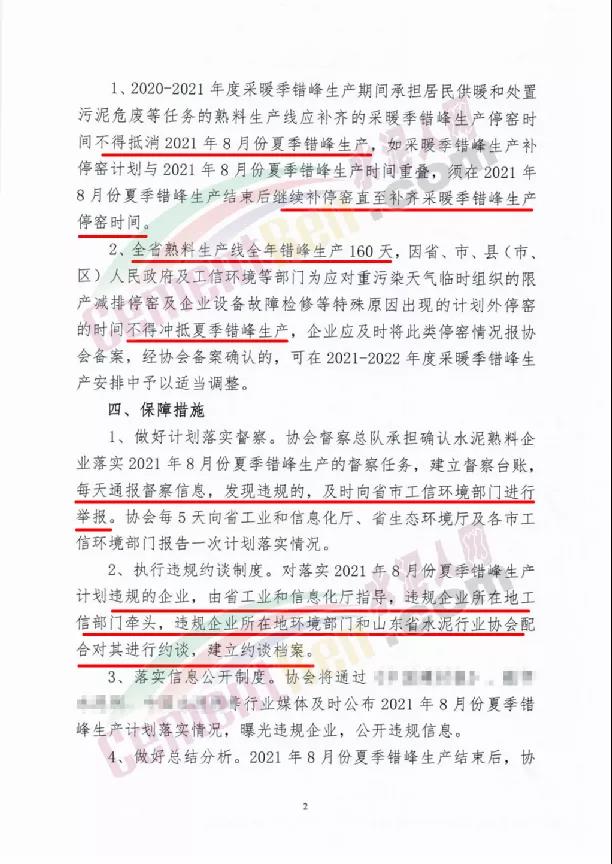 要求相關機構做好計劃落實督察,發(fā)現(xiàn)違規(guī)的,及時向省市工信環(huán)境部門進行舉報。同時,執(zhí)行違規(guī)約談制度。對落實2021年8月份夏季錯峰生產(chǎn)計劃違規(guī)的企業(yè),由省工業(yè)和信息化廳指導,違規(guī)企業(yè)所在地工信部門牽頭,違規(guī)企業(yè)所在地環(huán)境部門和山東省水泥行業(yè)協(xié)會配合對其進行約談,建立約談檔案。