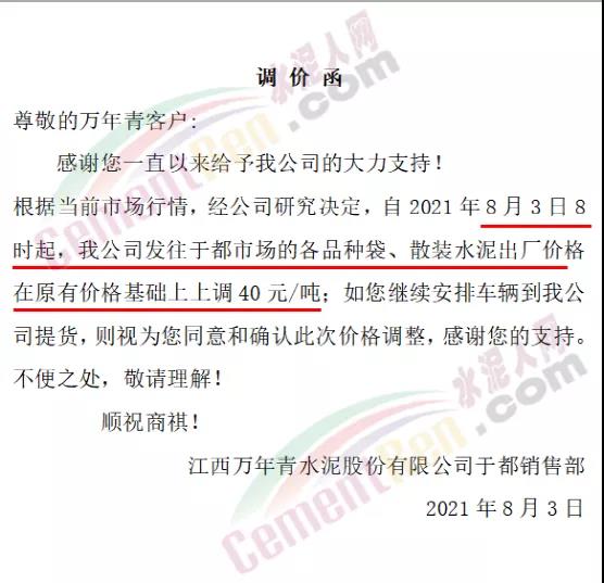 江西萬年青水泥股份有限公司贛州銷售部通知,自8月3日8時起,公司各基地發往贛州城區區域市場各品種袋裝水泥出廠價格在原價格基礎上上調30元/噸,各品種散裝水泥上調40元/噸。