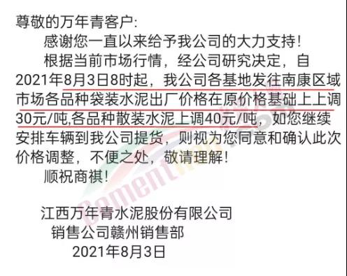 江西萬年青水泥股份有限公司贛州銷售部通知,根據當前市場行情,經公司研究決定,自8月3日8時起,公司各基地發往南康區域市場各品種袋裝水泥出廠價格在原價格基礎上上調30元/噸,各品種散裝水泥上調40元/噸。