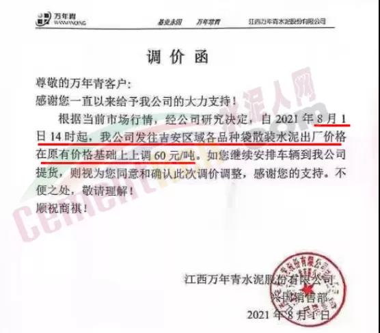 江西萬年青興國銷售部通知,自8月1日14時起,公司發往吉安區域各品種袋散裝水泥出廠價格在原有基礎上上調60元/噸。