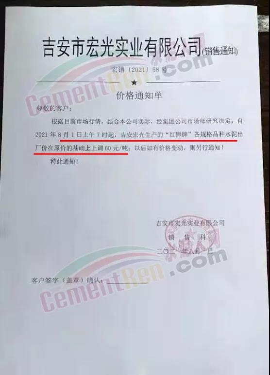吉安宏光實業有限公司銷售部通知根據目前市場行情。結合公司實際,經集團公司市場部研究決定,自8月1日上午7時起,吉安宏光生產的“紅獅牌”各規格品種水泥出廠價在原價基礎上上調60元/噸。