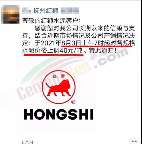 浙江麗水縉云縣紅獅水泥通知自8月5日起全品種水泥上調30元/噸。