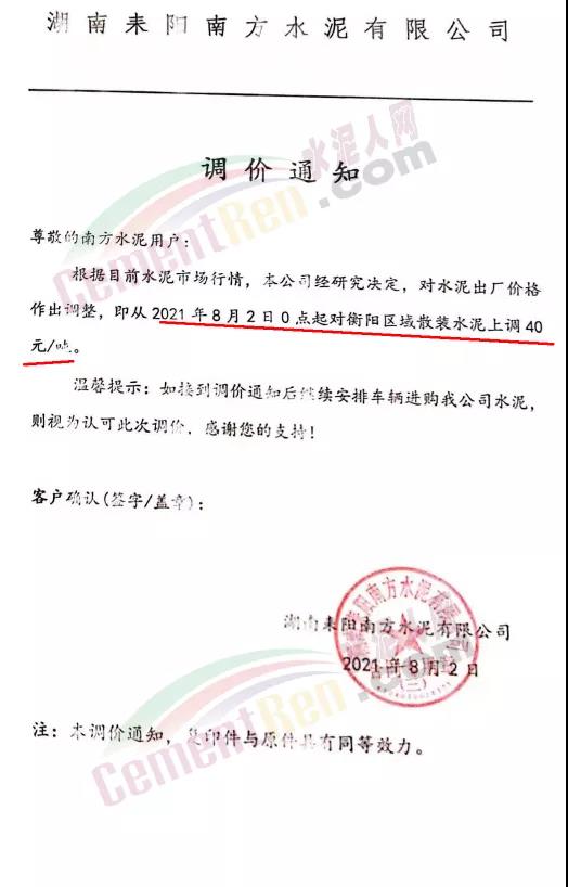 康達湖南水泥有限公司銷售科發調價通知單稱:根據市場情況,經研究決定從8月4日上午7時起,康達(湖南)水泥有限公司對湖南省內所有規格品種水泥合同價上調40元/噸。