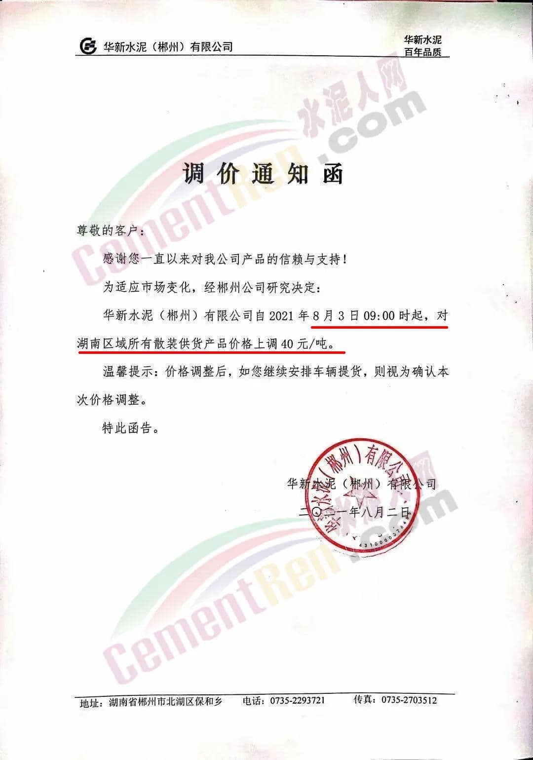 華新水泥(郴州)有限公司自8月3日上午9時起,對湖南區域所有散裝供貨產品價格上調40元/噸。