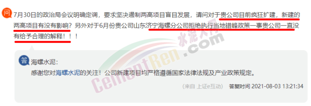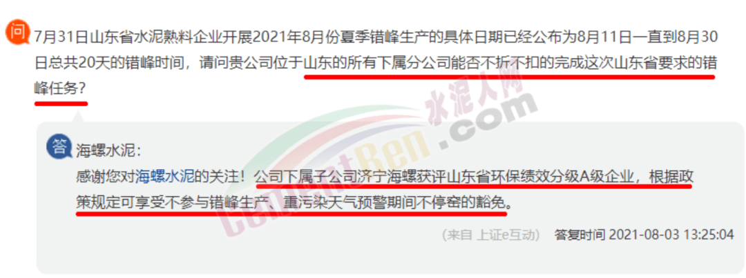 日前,有股友在上市平臺向海螺水泥提問,“7月31日山東省水泥熟料企業(yè)開展2021年8月份夏季錯峰生產(chǎn)的具體日期已經(jīng)公布為8月11日一直到8月30日總共20天的錯峰時間,請問貴公司位于山東的所有下屬分公司能否不折不扣的完成這次山東省要求的錯峰任務?”