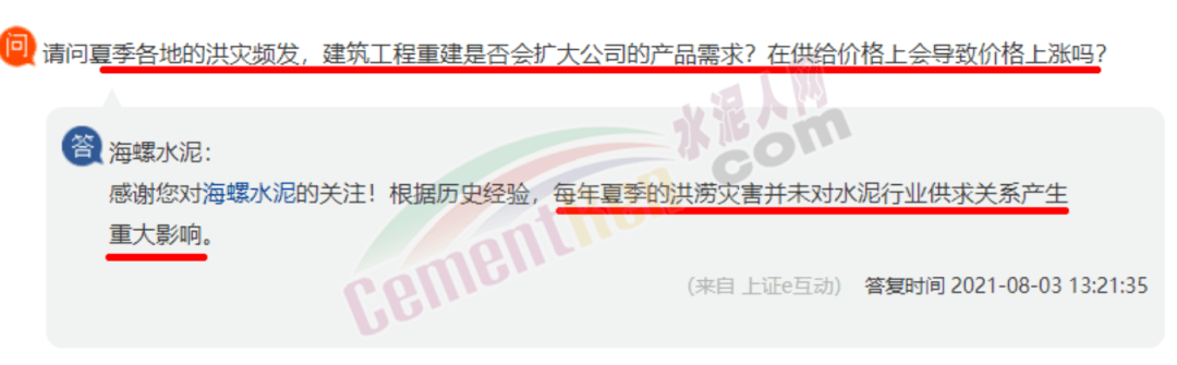 海螺水泥上市公司回復稱,根據(jù)歷史經(jīng)驗,每年夏季的洪澇災害并未對水泥行業(yè)供求關系產(chǎn)生重大影響。