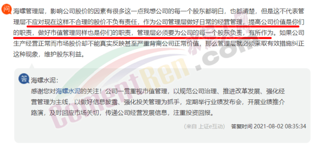 更有股民對海螺管理層直言稱:“影響公司股價的因素有很多這一點公司的每一個股東都明白,也都清楚,但是這不代表管理層不應對現(xiàn)在這樣不合理的股價不負有責任,作為公司管理層做好日常的經(jīng)營管理,提高公司價值是你們的職責,做好市值管理同樣也是你們的職責,管理層必須要為公司的每一個股東負責,有所作為。如果公司生產(chǎn)經(jīng)營正常而市場股價卻不能真實反映甚至嚴重背離公司正常價值,那么管理層就必須采取有效措施糾正這種現(xiàn)象,維護股東利益。”