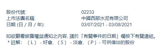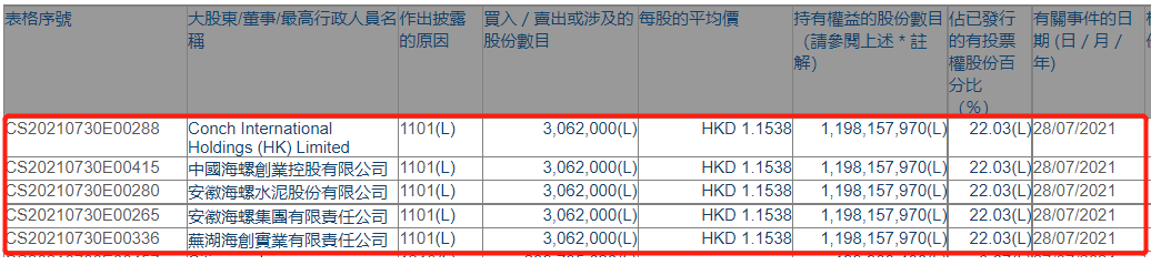根據(jù)聯(lián)交所最新權益披露資料顯示,2021年7月28日,西部水泥獲海螺水泥或其一致行動人在場內(nèi)以每股均價1.1538港元增持306.2萬股,涉資約353.29萬港元。