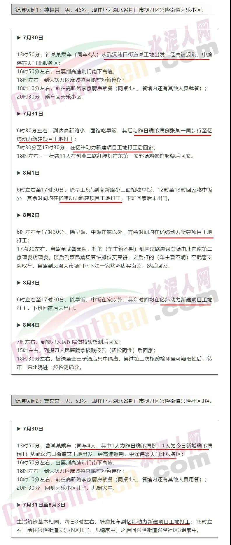 8月4日晚11時,湖北省荊門市發布消息稱,在對武漢沌口返荊人員排查中,發現1例新冠肺炎確診病例。同時,重慶市奉節縣也報告了1例從武漢沌口某工地務工返渝的新冠肺炎無癥狀感染者。這意味著武漢工地感染鏈開始向外溢出。